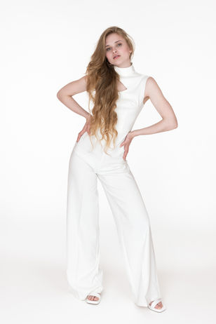Halter jumpsuit or wrap dress – metallic, sequined, or spandex (ideally all three)
